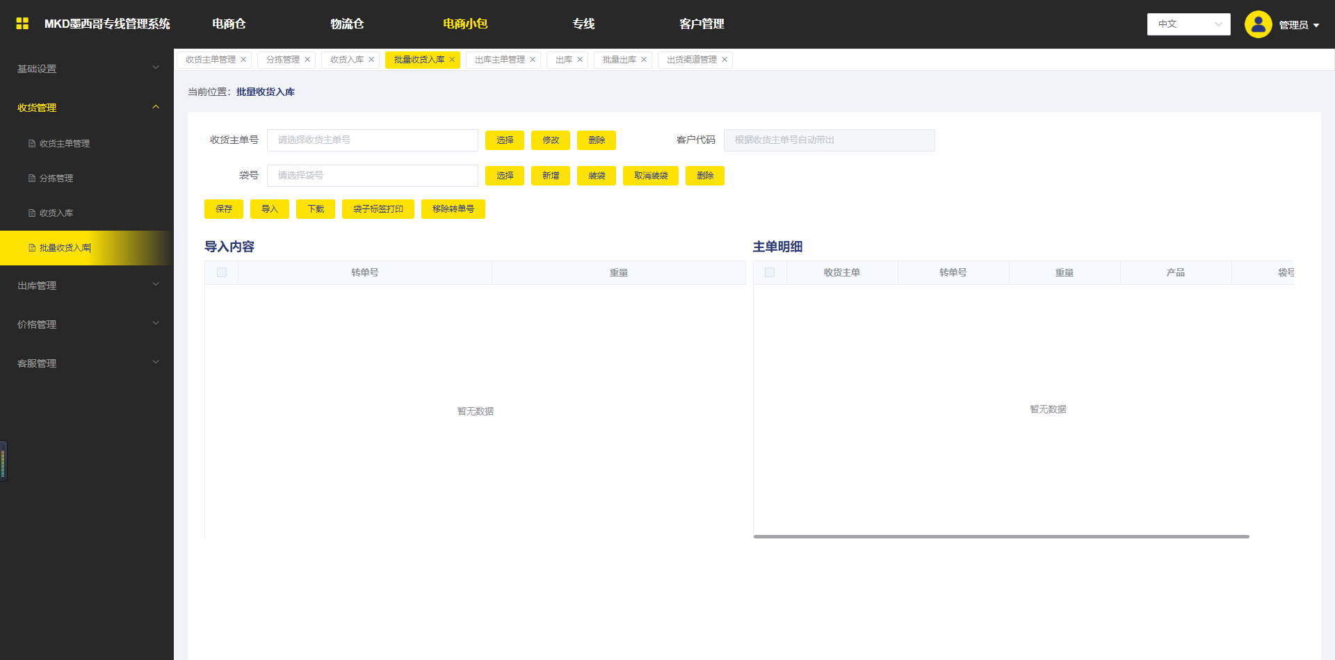 方式三:进入批量收货入库界面-》选择收货主单-》导入转单号(这里的转单号是已经预报成功的订单数据)-》勾选转单号-》点击保存-》进入收货主单管理-》完成主单-》收货完成。
