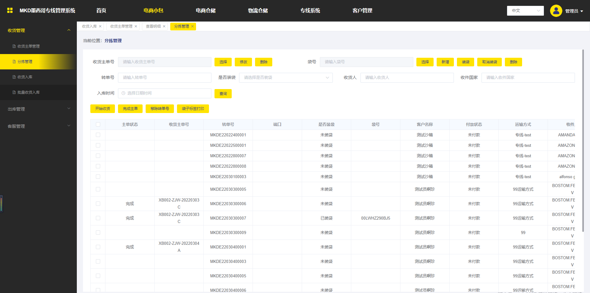 方式二:进入分拣管理界面-》选择收货主单-》勾选转单号-》开始收货-》选择性装袋-》完成主单-》收货完成;