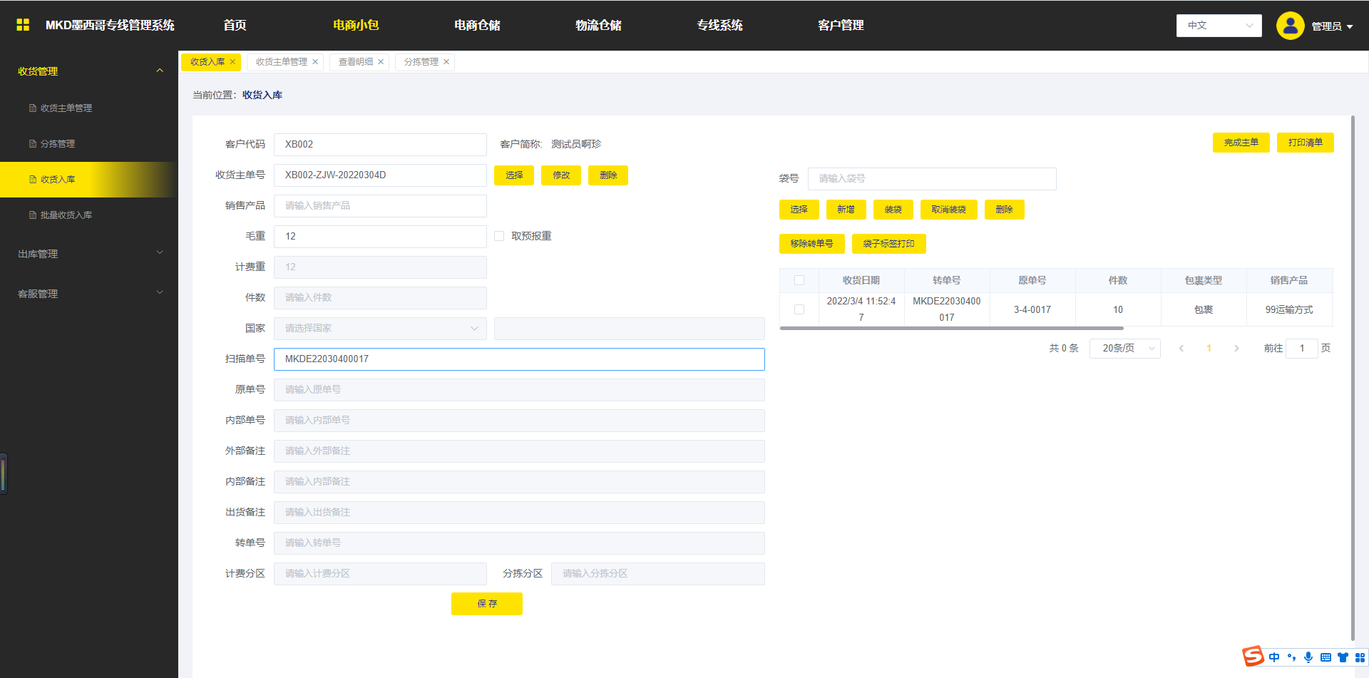 3.保存:选择收货主单号并勾选导入内容中转单号数据之后点击保存,即将转单号进行收货,保存之后的数据将展示在主单明细列表中;