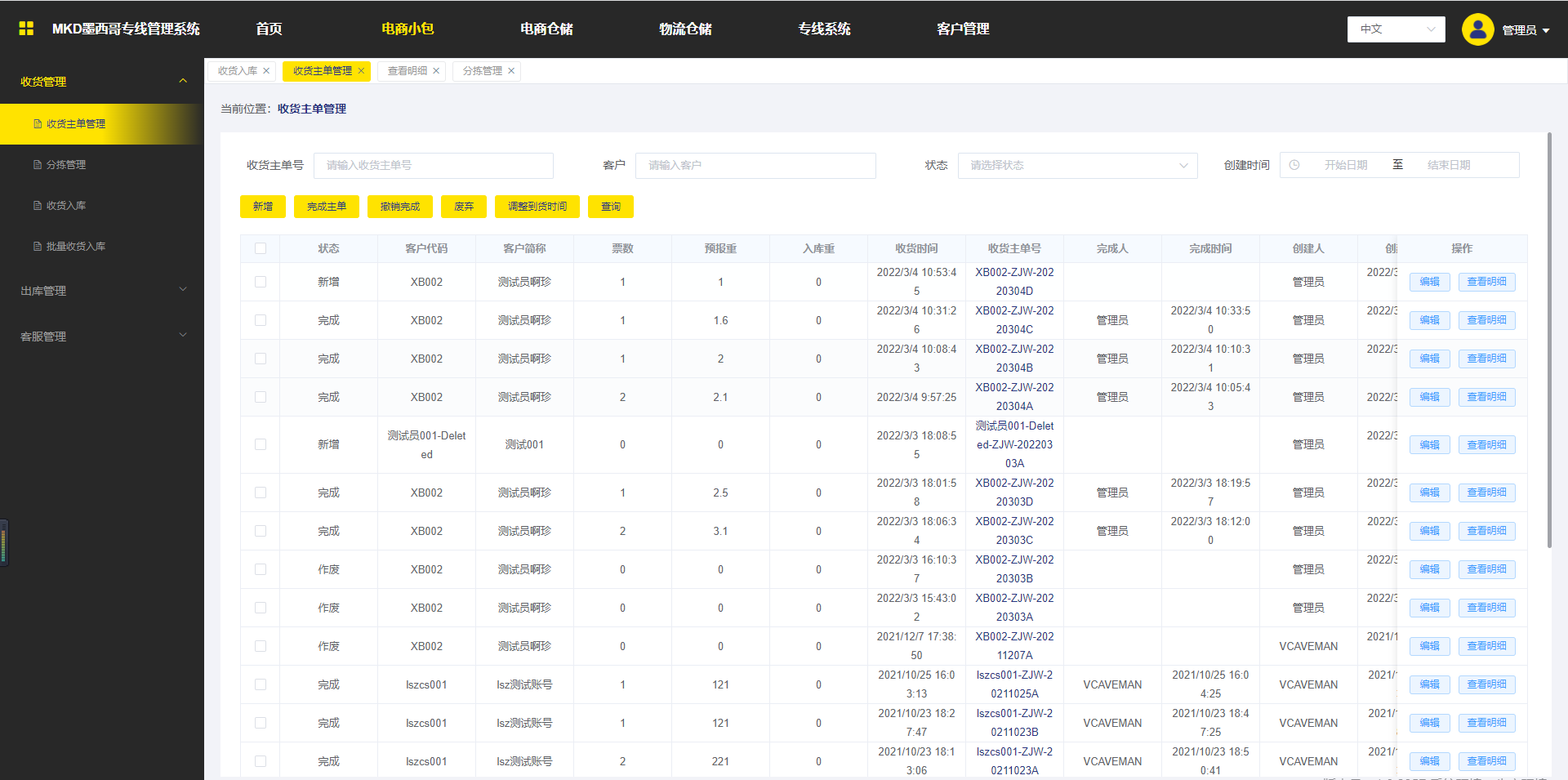 6.编辑:修改客户-》“新增”状态并且收货主单中没有明细(转单号);修改创建时间-》“新增”状态;“完成”状态不可编辑。