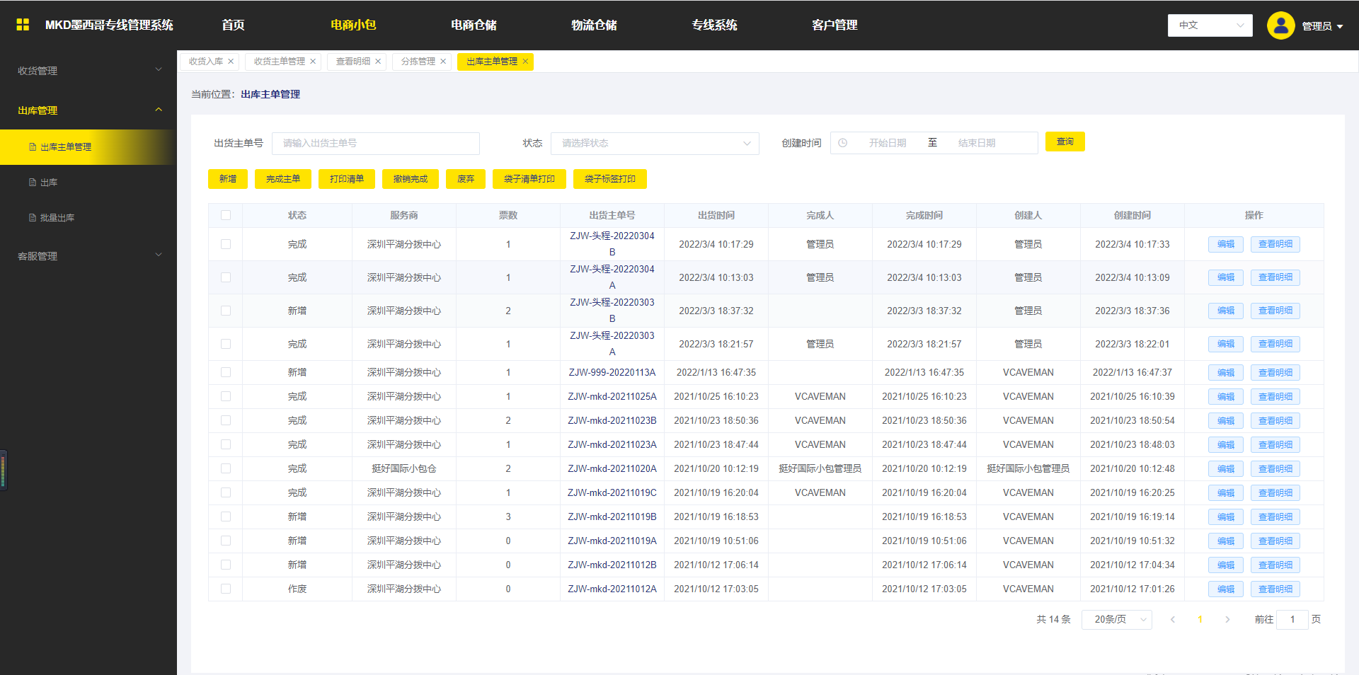 1.新增:新增一个出货主单,新增的出货主单的状态是“新增”状态;