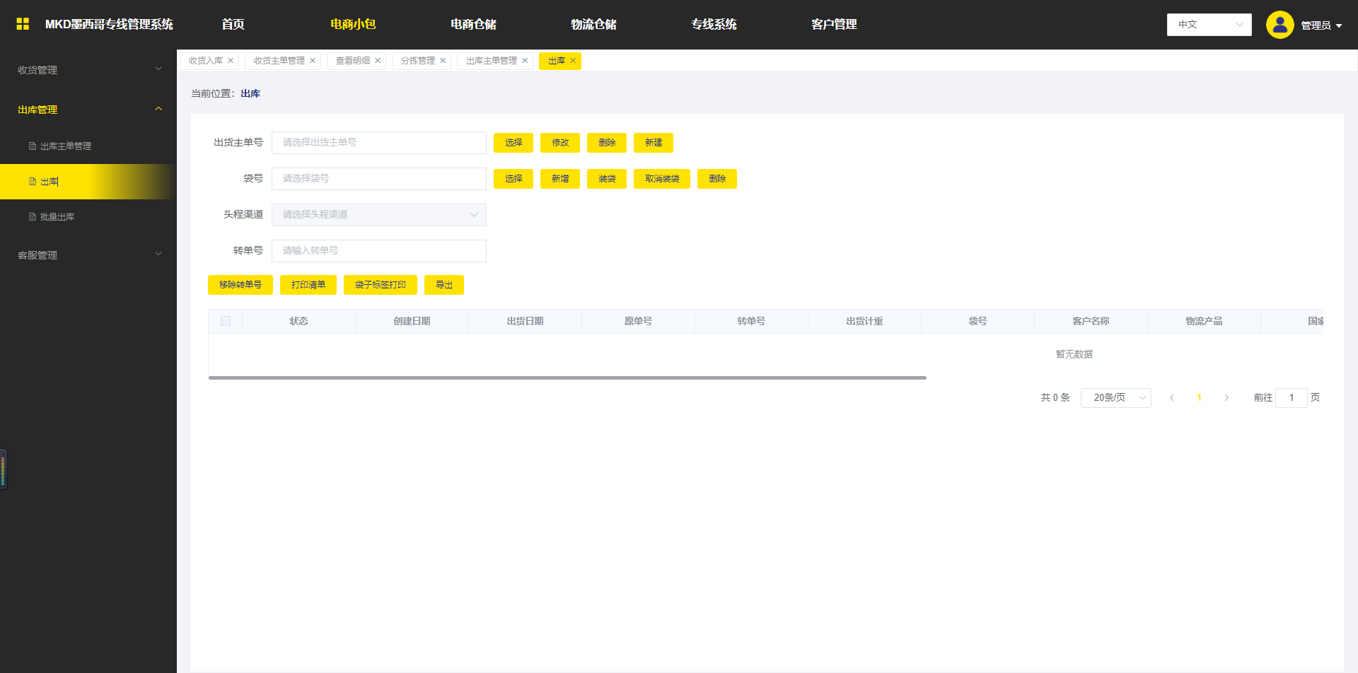 方式一:进出库界面-》选择出货主单-》扫描转单号-》选择性装袋-》进入出库主单管理-》选择出货主单-》完成主单-》出库完成;