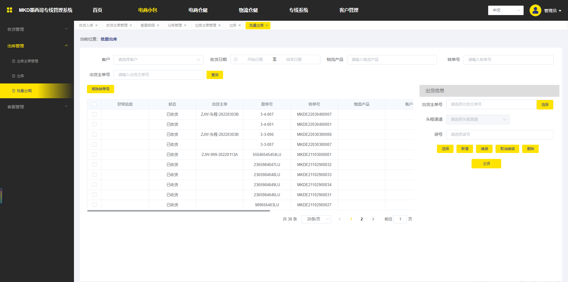 方式二:进入批量出库界面-》选择出库主单-》勾选转单号-》选择性装袋-》点击出货-》进入出货主单管理-》完成主单-》出库完成。