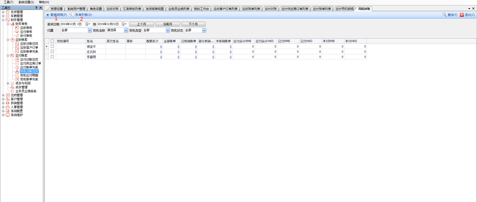 点击左侧菜单“司机对账总览”,看到如上图的司机对账列表