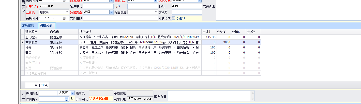 调度列表要在保存之后才可以输入的,在这里可以对这份单进行车辆安排、报关、清关等操作。
