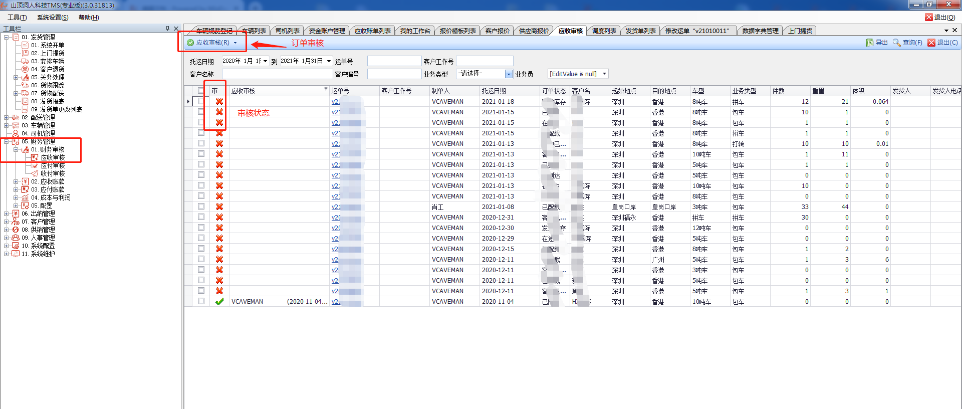 在系统开完单后,路费用之后,到应收审核中可以看到数据,直接点击单号,会跳转到订单详情页面,财务这边的同事对进行审核。