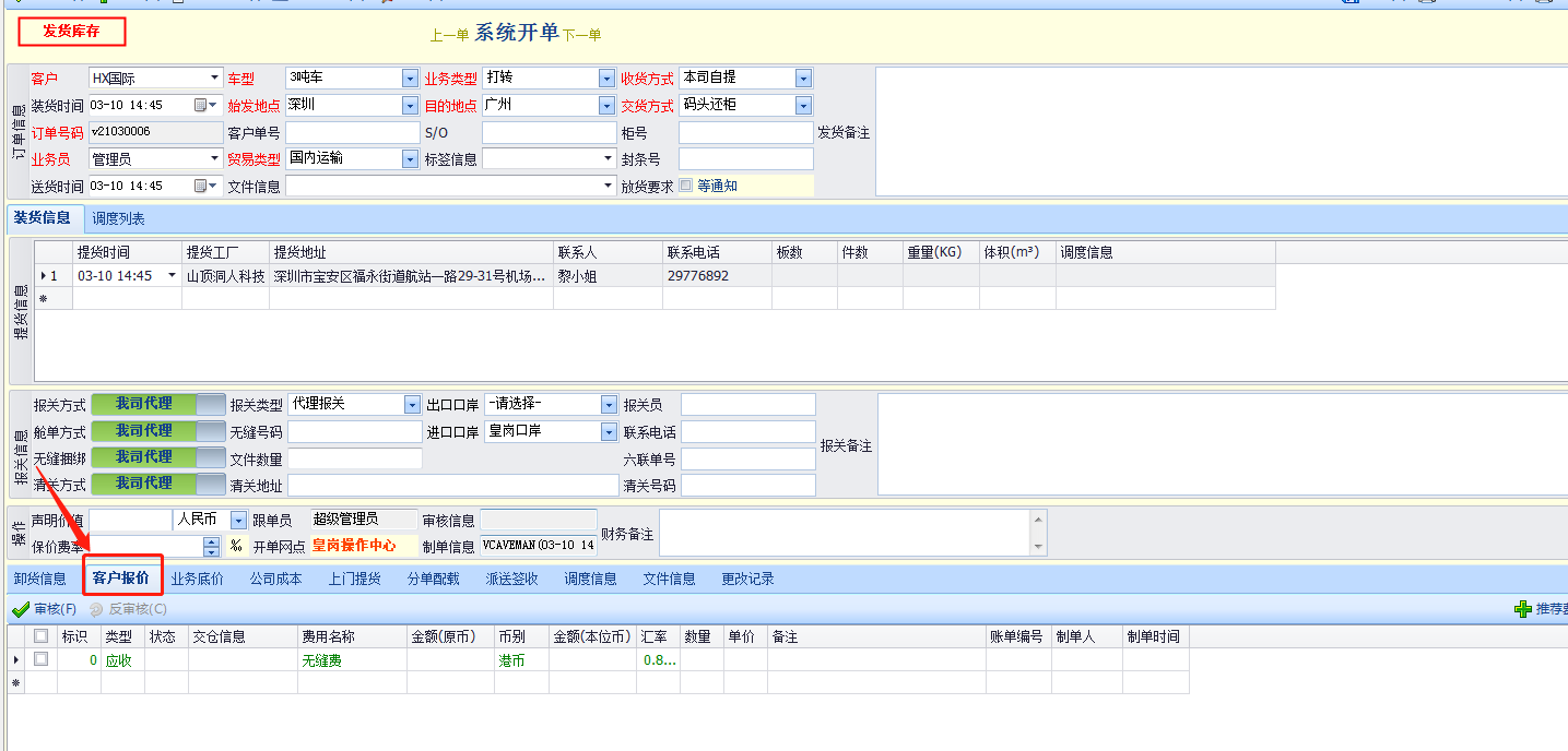 在开单的页面中下面 客户报价中这里是输入费用的,根据订单要收取的费用,来对订单进行添加费用,前提是要先将订单保存,订单保存后,就可以输入费用了。系统会默认几条费用,这个可以根据订单经常来录的费用来设置。