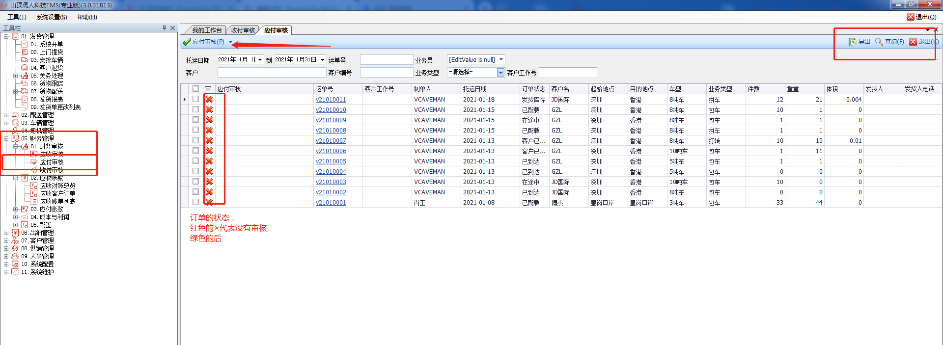 应付审核的操作和应收审核的操作是一样的都是根据订单来审核,审核后的状态也是一样的审核通过就是绿色的勾,红色的×就是一个未通过的状态。
