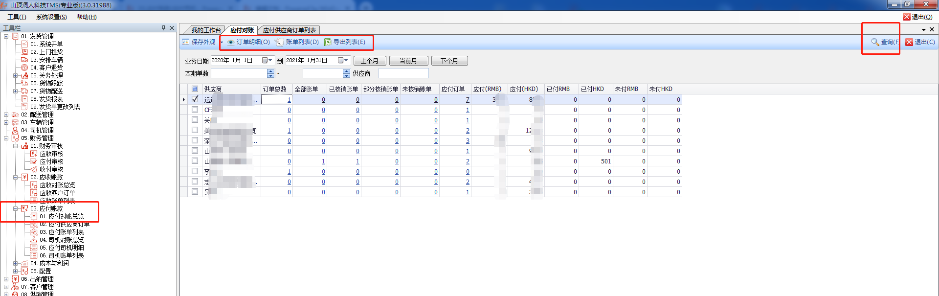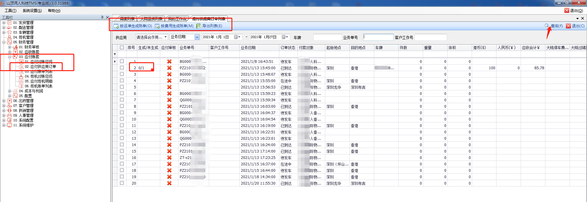 在应付供应商订单页面中和在应付对账总览页面中的订单明细是同一个界面,可以根据选择的供应商来查看该供应商下的订单明细。也可以选择根据运单生成账单 根据订单生成账单 运单他是整票货所会涉及的费用都加上去了,费用他是在这票货中所涉及到的费用来生成的。