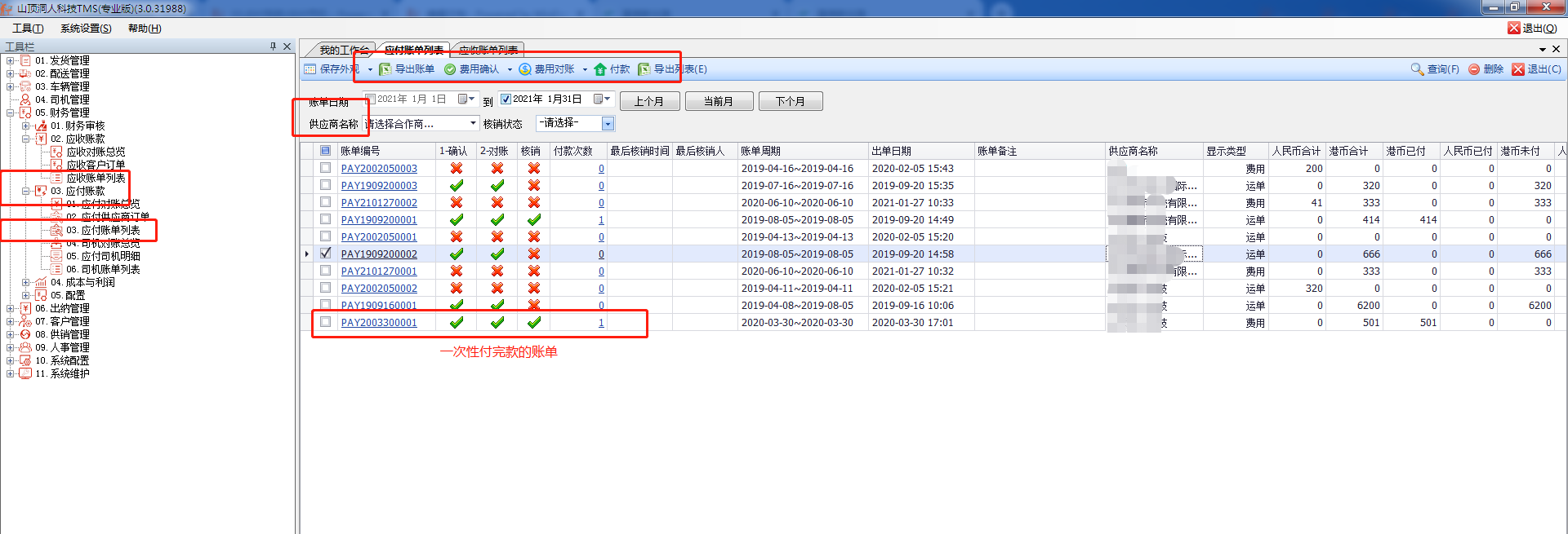 这里就是一个审核、收款的操作了,具体操作和应收账单列表中操作差不多,只是一个收款,一个付款。导出账单 在应付供应商订单 生成账单的时候选择的模板中,在这里可以直接将这个账单根据生成时选择的模板导出来,之后就是费用的确认-对账-付款操作。可以对账单进行删除的,费用确认了之后就不可以删除了,只能在账单的三个状态都是红色的×才能进行删除,删除对应的订单或费用这些就需要重新生成了。