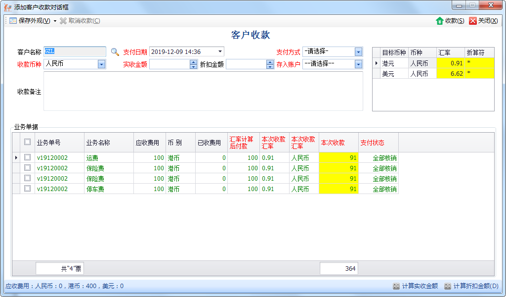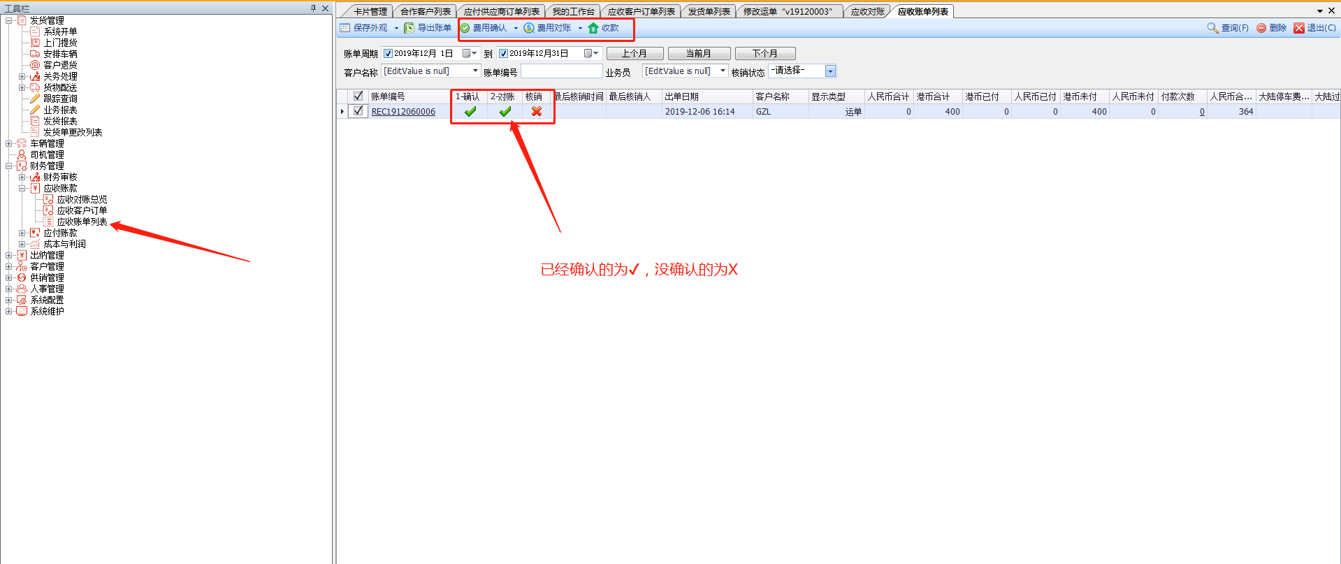 4.销账界面,红色为必填项。收款完毕代表销账结束,在“应收对账列表”账单的核销状态为√。