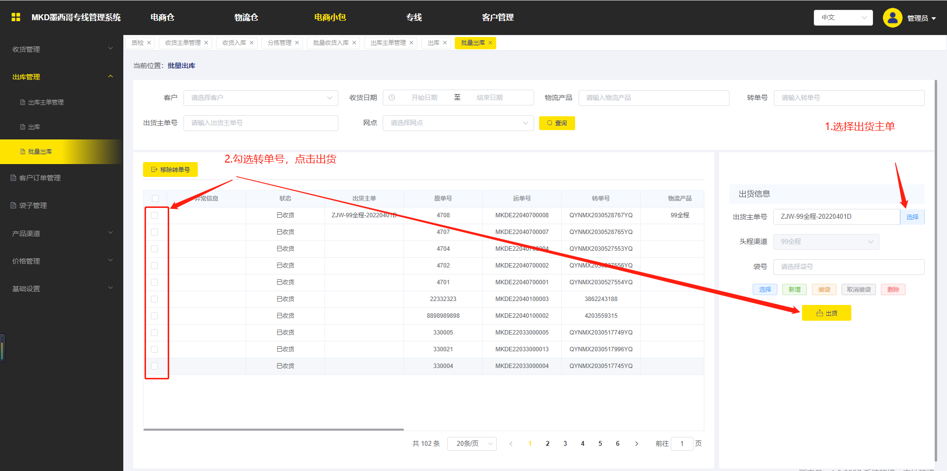 方式二:进入批量出库界面-》选择出库主单-》勾选转单号-》选择性装袋-》点击出货-》进入出货主单管理-》完成主单-》出库完成。