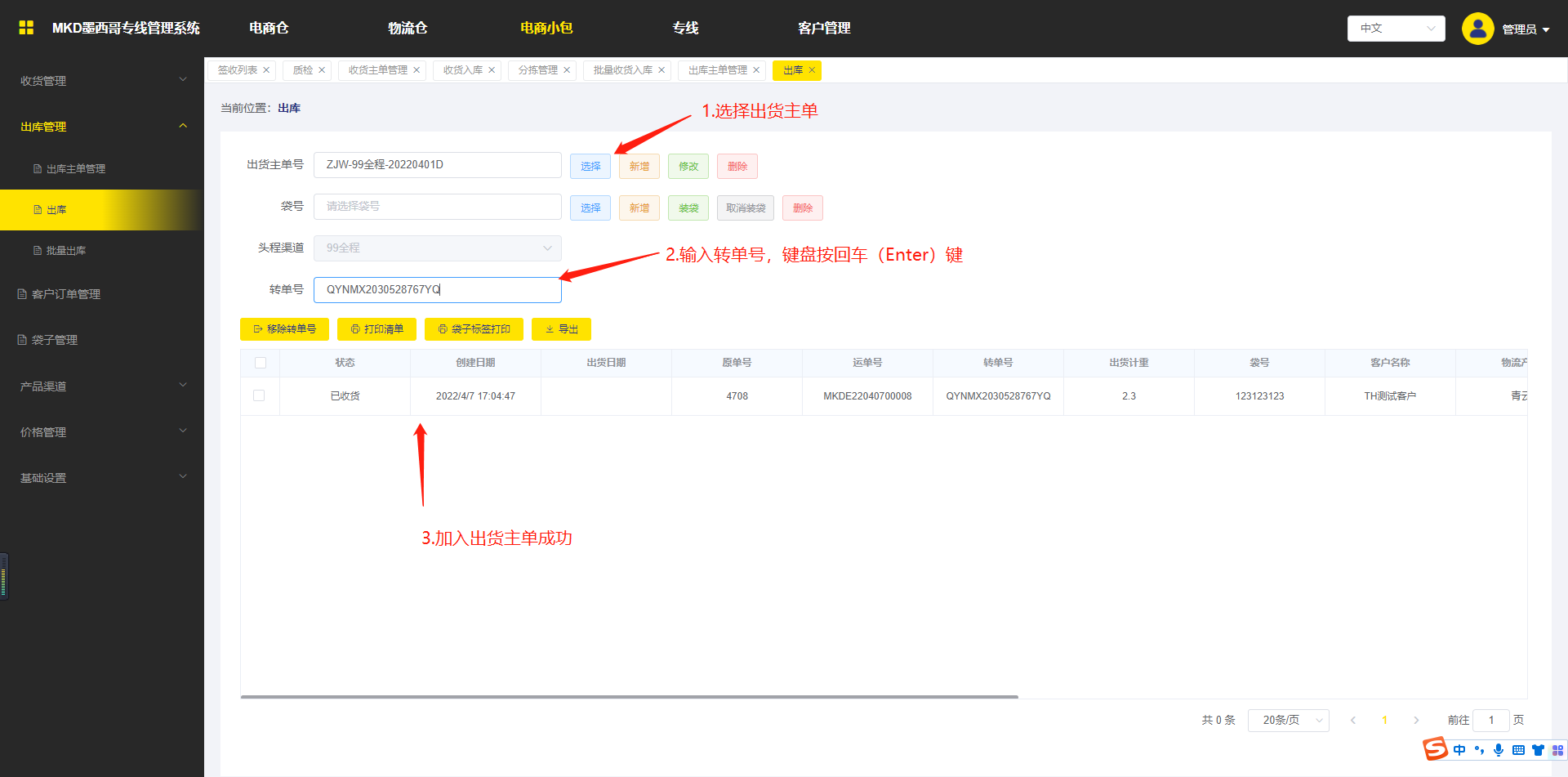 方式一:进出库界面-》选择出货主单-》扫描转单号-》选择性装袋-》进入出库主单管理-》选择出货主单-》完成主单-》出库完成;