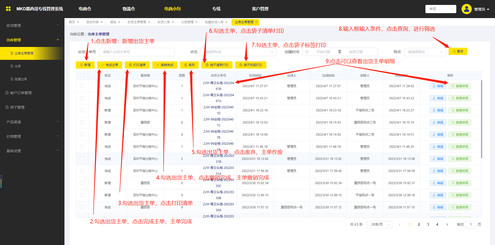 1.新增:新增一个出货主单,新增的出货主单的状态是“新增”状态;